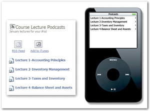 Podcasting - Learning on the go. Students download lectures and video to any MP3 player or play in a standard browser – no MP3 player required. Text items are syndicated to RSS-enabled browsers or readers.